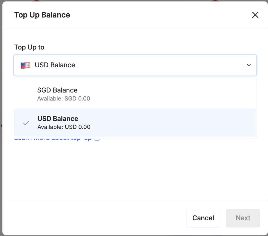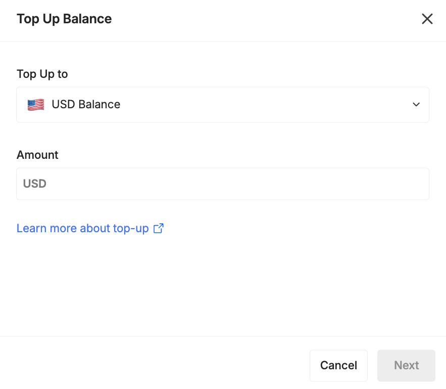 - Choose which currency you wish to Top Up and input the amount, click Next