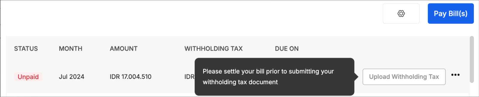 Jika Anda telah membayar tagihan Anda tetapi masih tidak bisa mengunggah Bukti Potong, mohon untuk dibantu periksa hal-hal berikut: