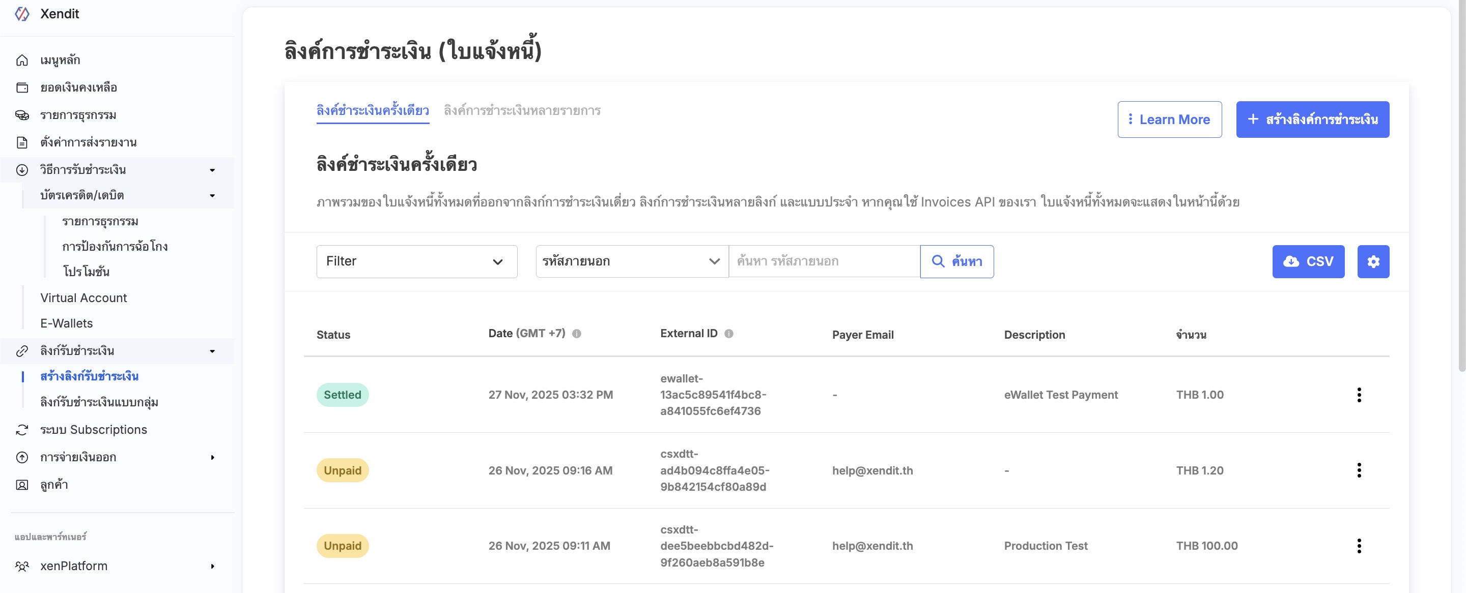 3. ค้นหารายการด้วย External ID (รหัสภายนอก), Invoice ID (รหัสใบแจ้งหนี้), Payer Email (อีเมลผู้ชำระเงิน), Description (รายละเอียดรายการ) หรือ ปลายทางการชำระเงิน